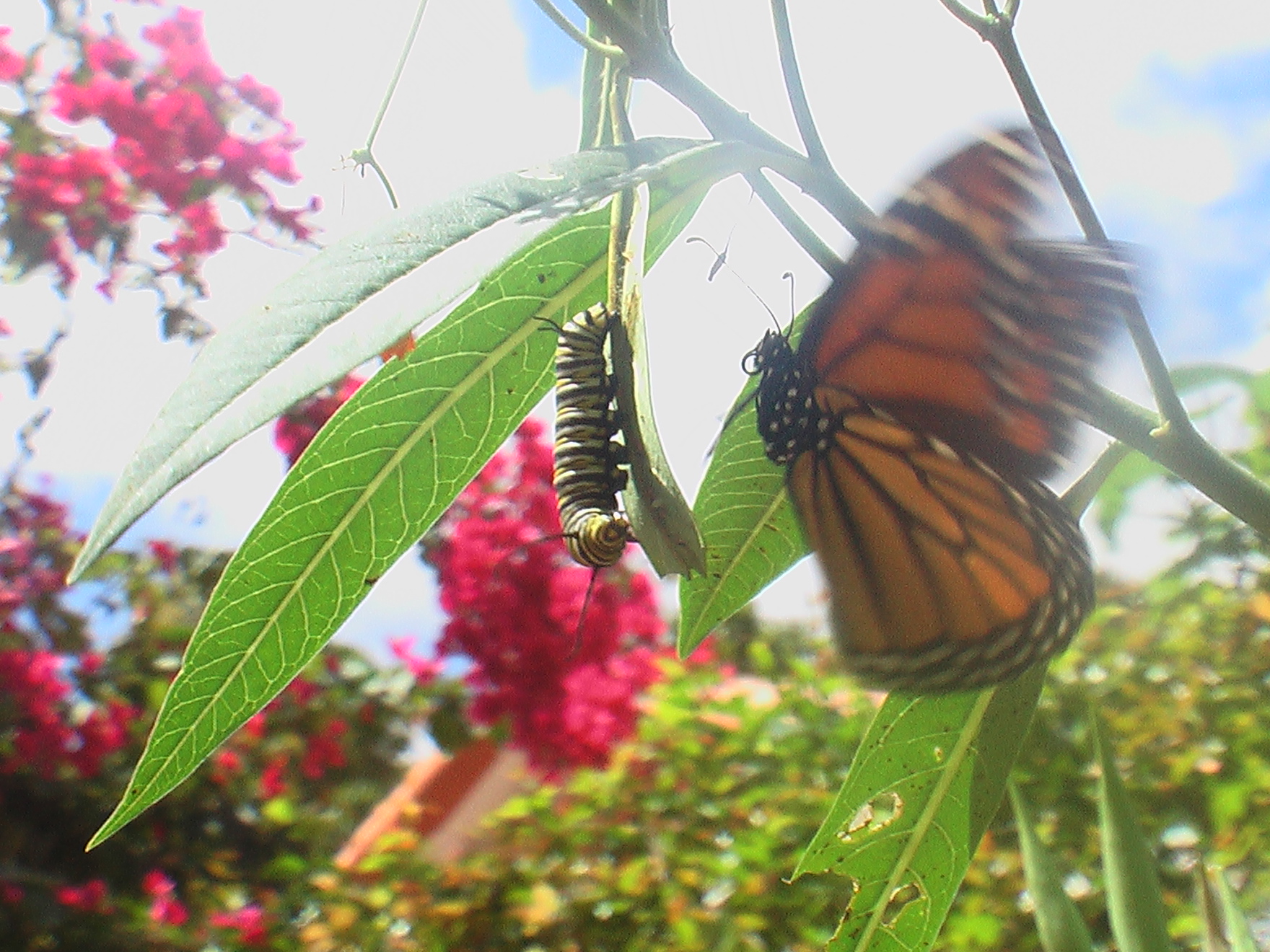 I took this picture couple of months ago. I was crouching down taking a picture of the caterpillar against the sky when all of a sudden, this butterfly appeared and I snapped the picture. It was a magical moment for me. That is how life should be…full of many magical moments…why not?